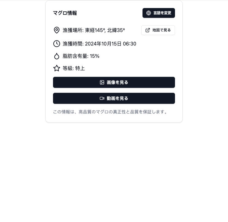 View the exact catch location on an interactive map and see authenticated images taken at the time of catch, providing complete transparency of origin.インタラクティブな地図上で正確な漁獲位置を確認し、漁獲時に撮影された認証済み画像により、原産地の完全な透明性を提供します。